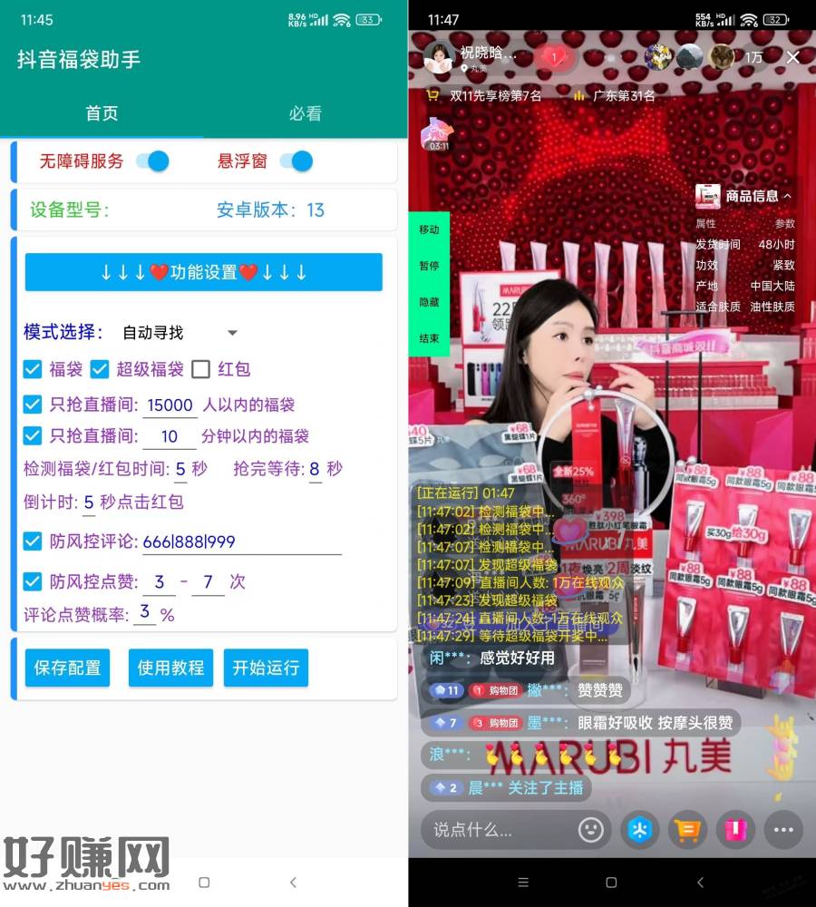 双十一马上来了 抖音很多直播间为了留住用户会一直发福袋 有闲着的手机可以挂着玩玩 可以全天24小时自动抢福袋