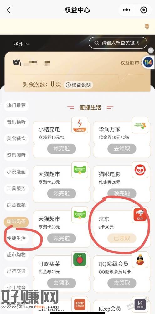 4、领取权益——进入领取页面往下翻到便捷生活模块,其中有京东e卡30元,成功领取后有短信,或者领取其他的,按领取页面教程绑定。