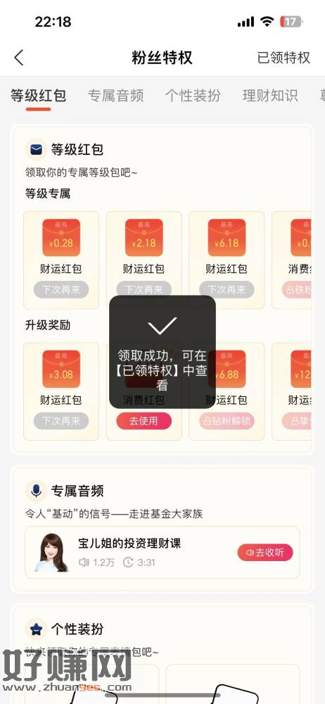 zfb搜 华宝基金财富号 粉丝中心 等级红包 得0.1消费红
