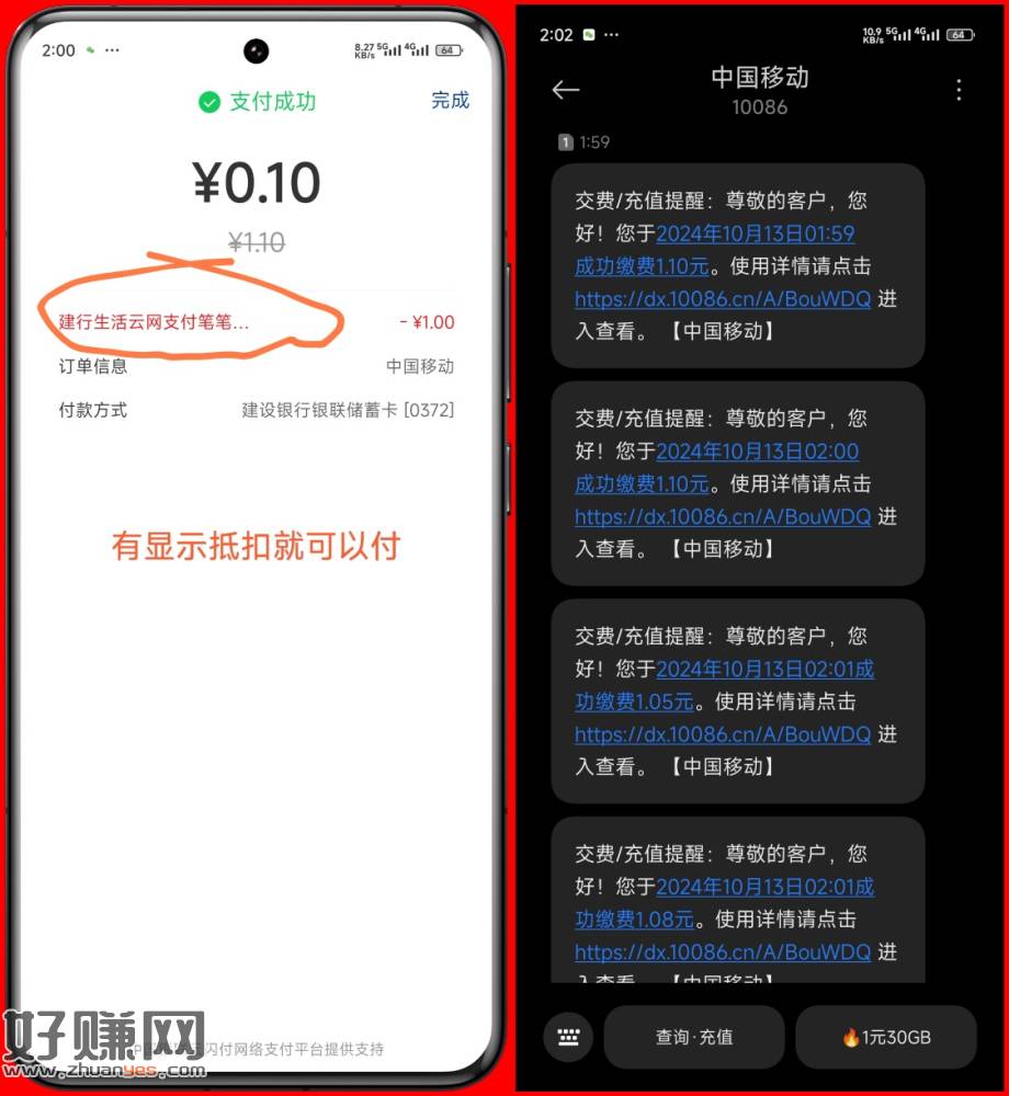 移动app充值话费选自定义,输入1.1,支付选云闪付,再选建行生活