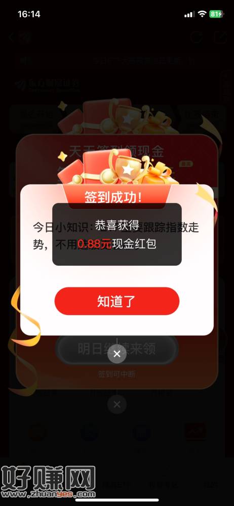 东方财富首次签到必得红包,我是0.88,后面的看脸