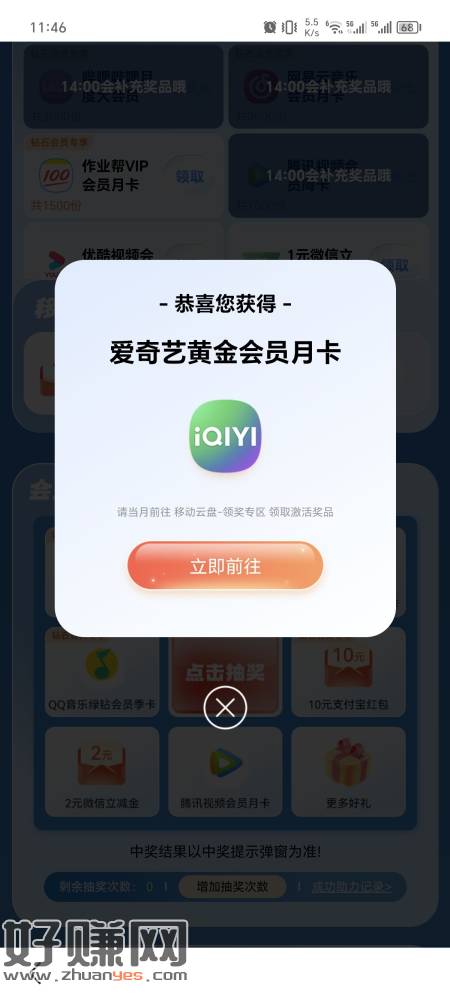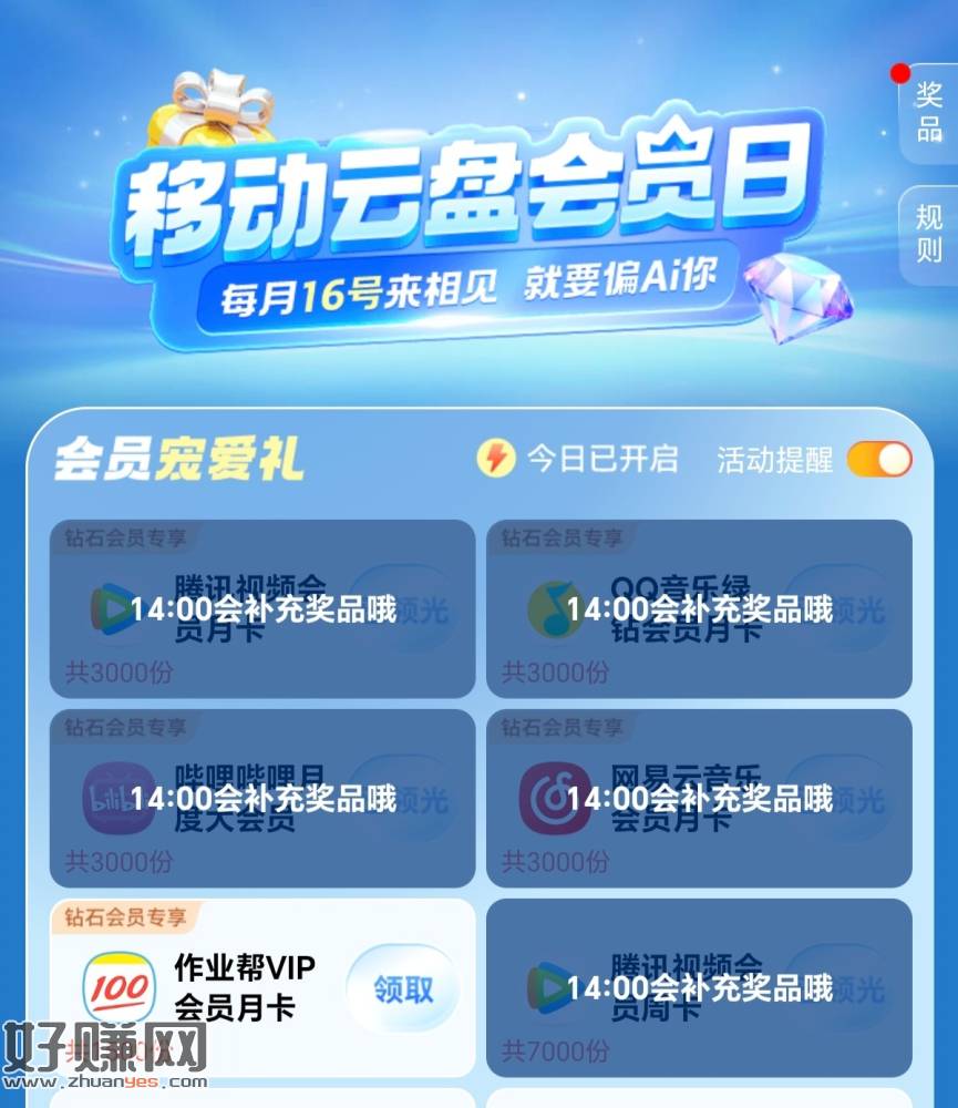 移动云盘首页中间横幅,会员用户下拉转盘直接抽,非会员用云朵兑换一个会员,宠爱礼两点补货。