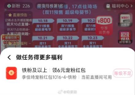 李佳琦直播间 现在购物车里有铁粉6元红包