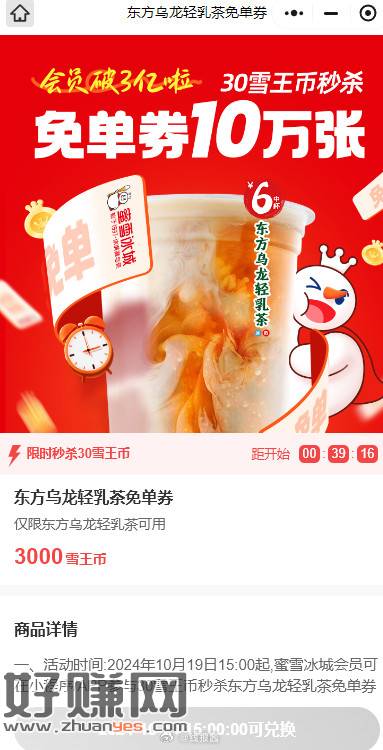 15点,如有30雪王币可兑换蜜雪乌龙轻乳茶免单券
