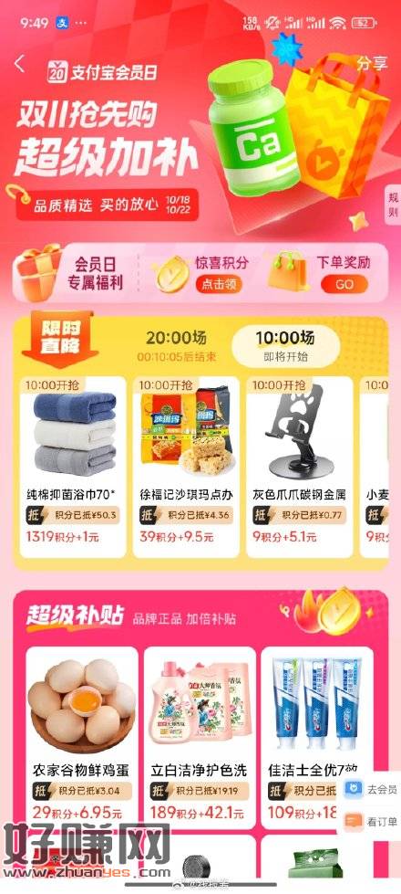 10点支付宝1319积分+1元兑换毛巾