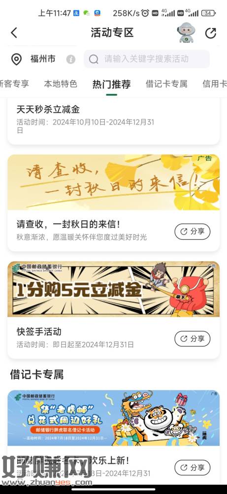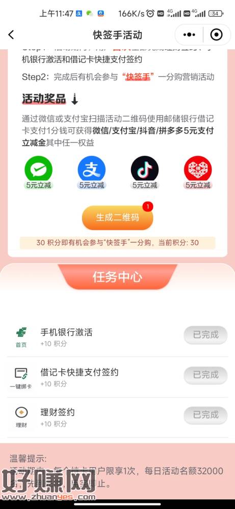 邮储银行活动中心,快签手完成任务0.01买5立减