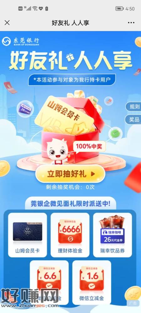 东莞银行APP,生活-顶部滑动栏:企微见面礼,点进去跳转到微信加企微后,点推送的链接进去抽奖,可中山姆会员卡、瑞幸咖啡券、微信立减金等,规则说100%有奖,刚中瑞幸咖啡券。注意:有东莞银行账户的去,没有的请忽视!!