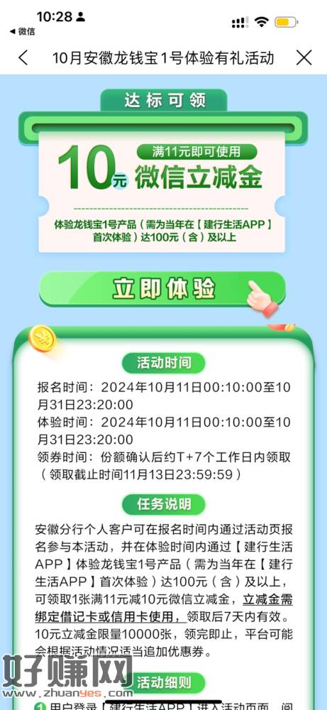 建设银行 龙钱宝体验有礼 10元立减