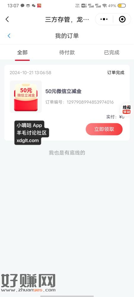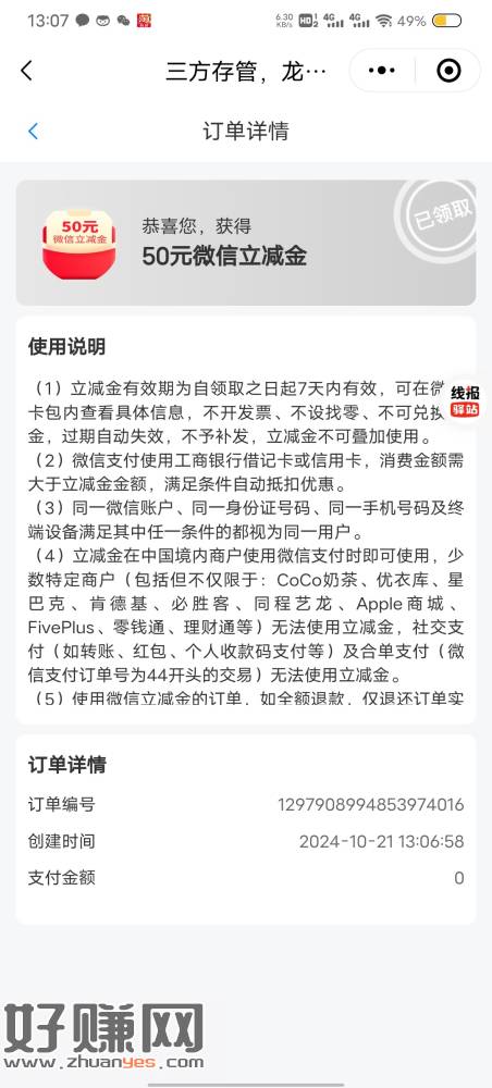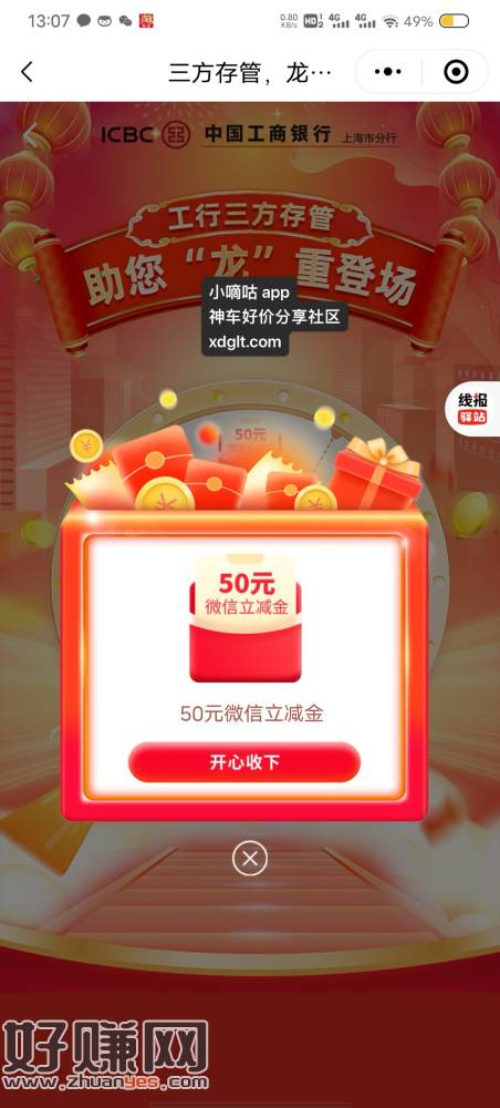 【专属福利】尊敬的客户,您已成功开通工商银行第三方存管账户,有机会抽取最高50元微信立减金,立即搜索“工银上海”微信小程序,点击“银证存管—工行三方存管助您‘龙’重登场”活动专区参与抽奖,数量有限,抽完即止。如有疑问可咨询工行上海各网点。如您已获取上述立减金,请忽略本短信。本短信转发无效。回复TDZX退订。【工商银行】