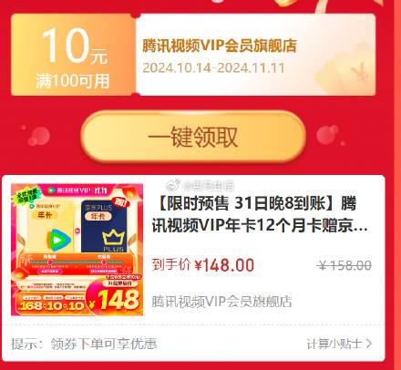148亓 31日晚20点到账,腾讯视频年卡+京东Plus年卡