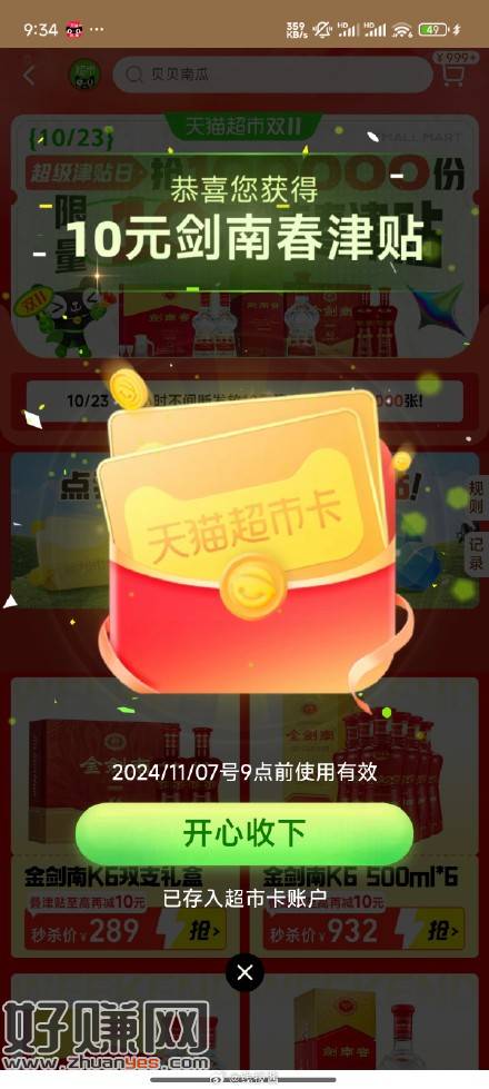 猫超右下角惊喜口令,输入【剑南春津贴】有10元无门槛品牌金