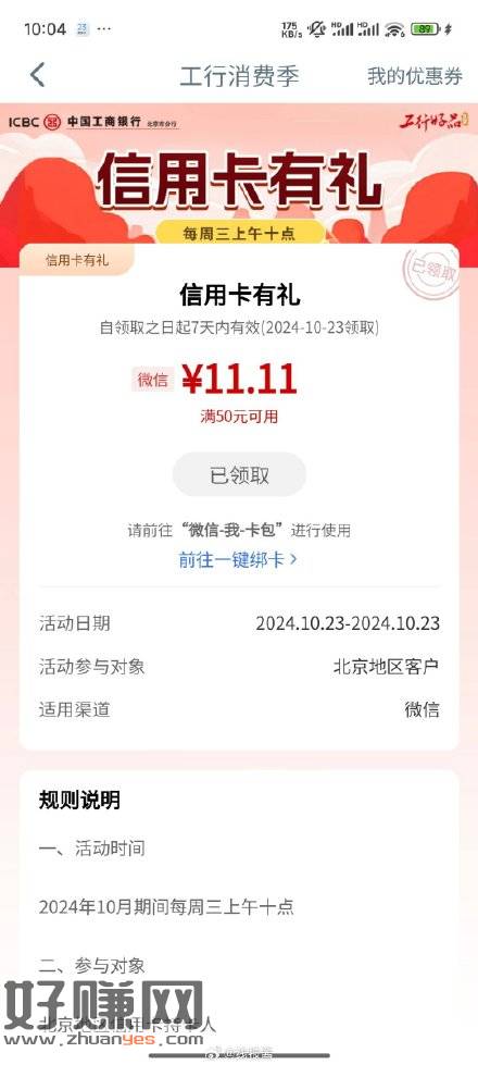 北京工行搜消费季,可领50-11.11信用卡立减金