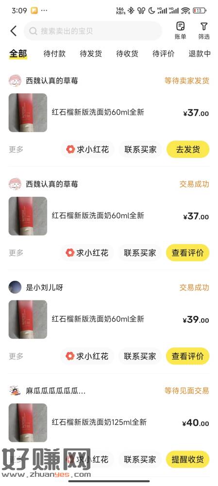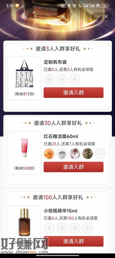大毛还有:雅诗兰黛邀请好友入会,红石榴洁面闲鱼37到45大量有人收收,邀请30人就能领,建议放单弄,放单20分钟就能拿一单