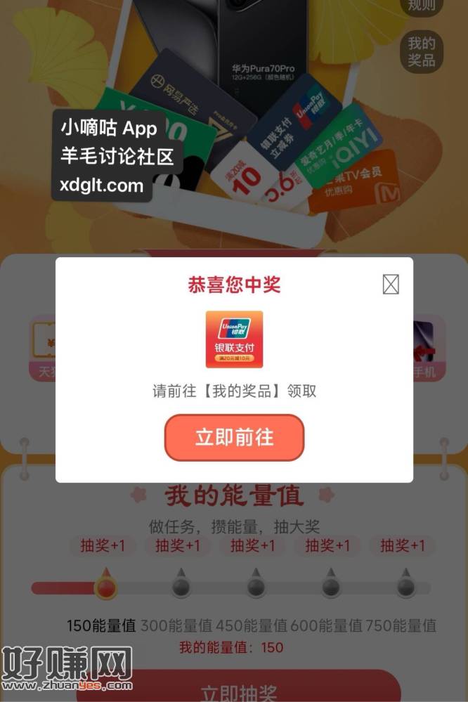 中信银行App ,热门活动,能量值大抽奖,抽奖保底20减10银联优惠支付券,度小满扫码抵扣。