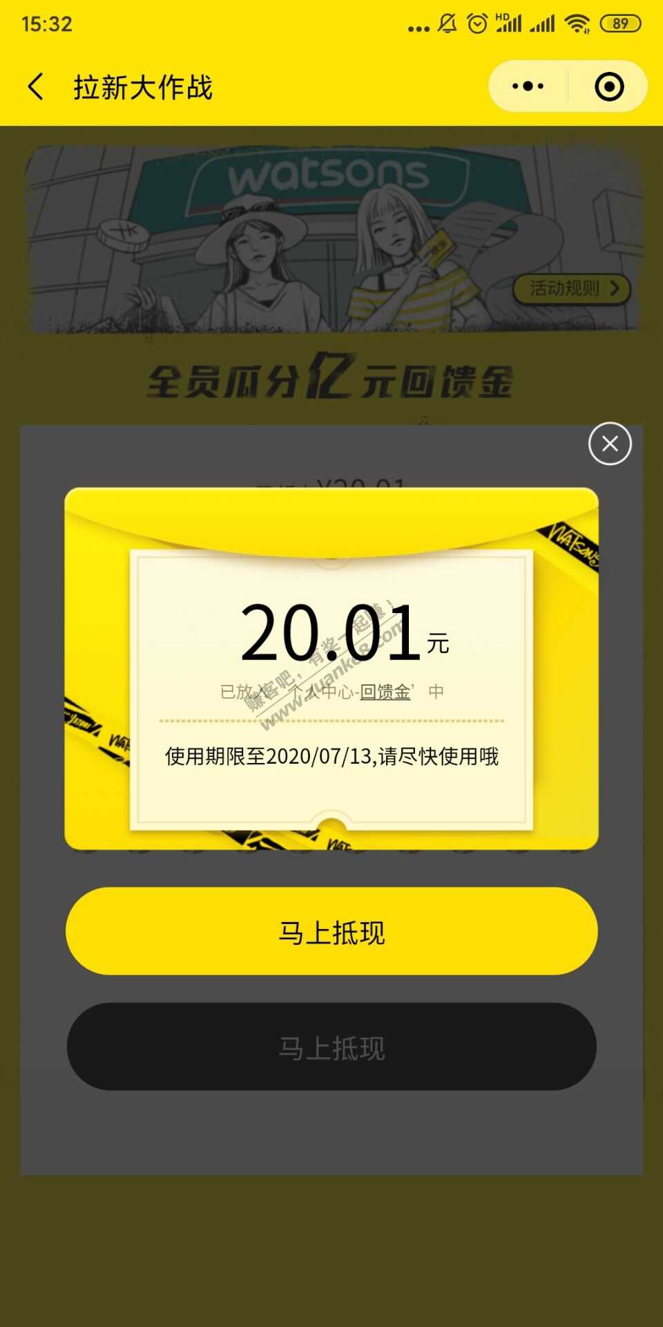 活动:微信关注“屈臣氏云店”小程序,首页有瓜分亿元回馈金。点进去,邀请10个人点就能得到20元的全场通用金!