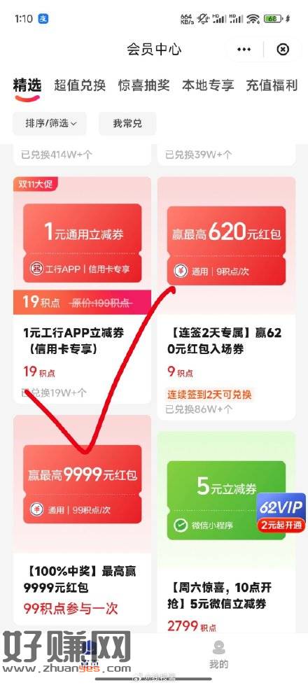 云闪付会员中心,积点可以兑换1元工行App立减券,限制信用卡