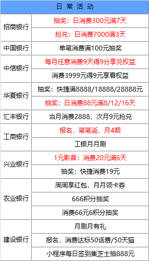 报名参与,每周线上或指定MCC消费满3笔累计满1500元(或满3笔累计满4000元),累计达标相应周数即可参与积分瓜分,最高限获30万积分(按活动期间总消费占比瓜分)