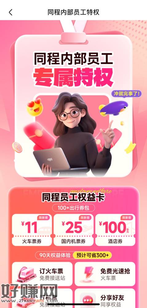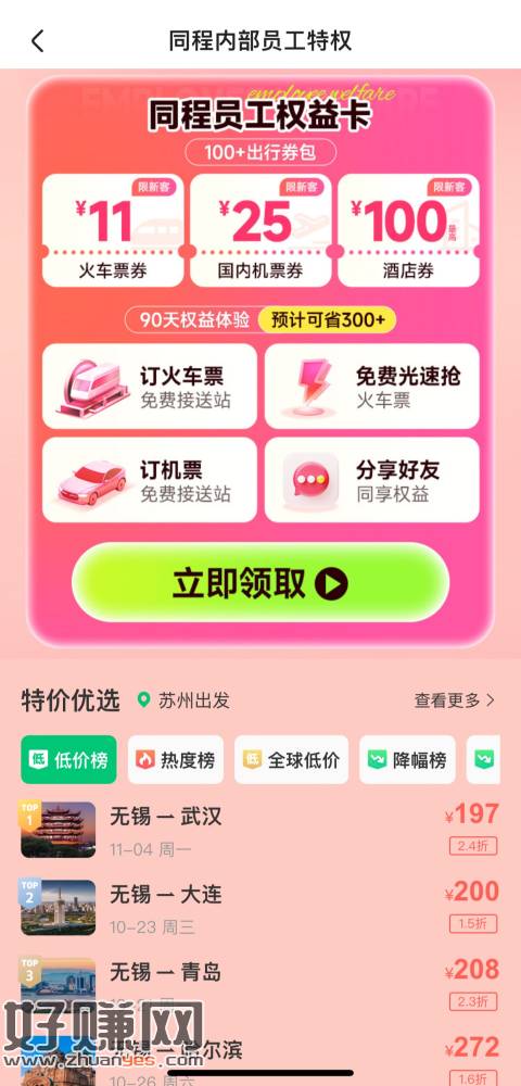 【31-11元火车票券】同程旅行挨批批搜索“员工福利”->直接领权益会员,有火车票31-11亓券 和-25飞机票券 部分城市享飞机/火车免费接送站