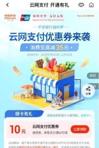平安银行app首页搜索云网支付开通有礼,然后按照活动要求去开通云网支付,可以领一张60-10的券