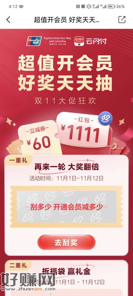 云闪付羊毛,首页横幅抽奖,大概率中20元券,开通腾讯联合月卡