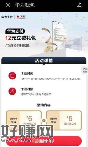 华为钱包充值交通卡,广发储蓄卡50-6,每天一次,活动期总共2次