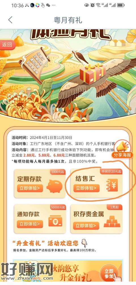 搜粤月有礼,结售汇满20元抽中微信立减金。