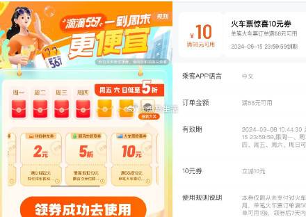 【滴滴出行领58减10亓火车票券】打开活动地址->直接领取滴滴券包,其中包含火车票满58减10亓券,刚好要买火车票的还不错