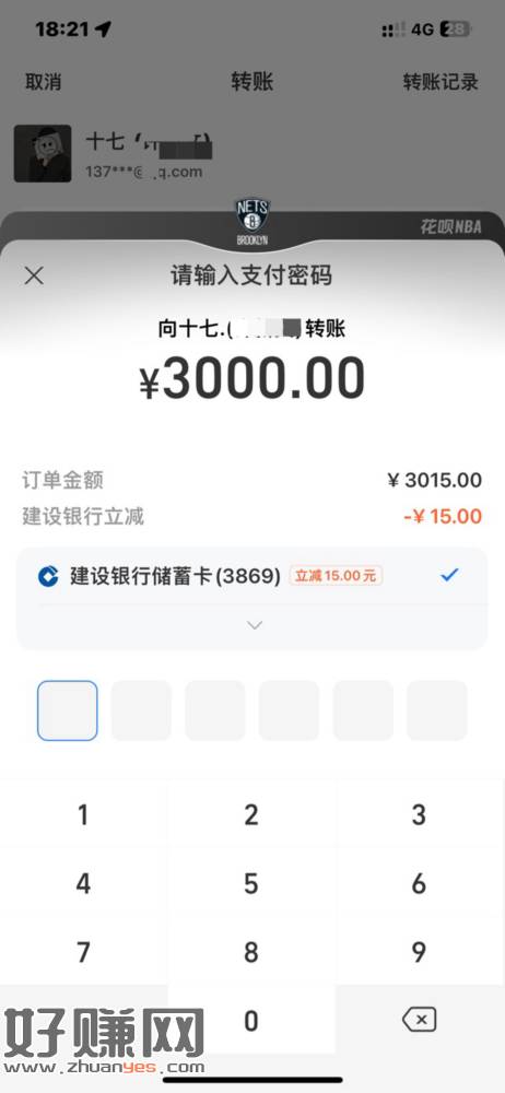 中山建行ZFB转账3000-15有无自测