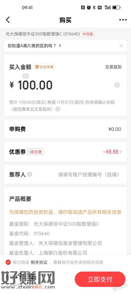 京东金融搜-光大保德信基金财富号,有张8.8,是100-8.8,我买了500指数增强,怕风险可以买90天债基