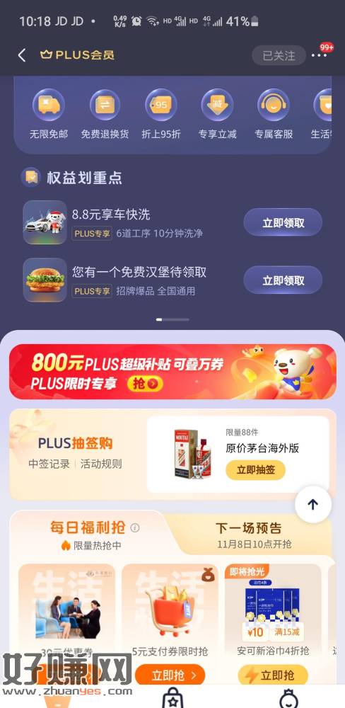 路径京东APP-plus会员-您有一个免费汉堡待领取,还有七万多份