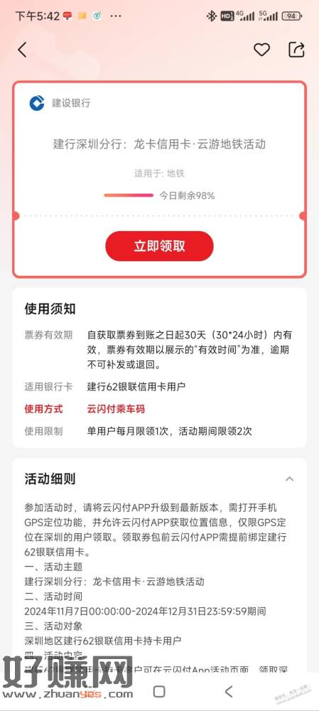 云闪付搜云游地铁领,30天内有效