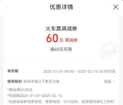 速度领,火车票券满60-60元