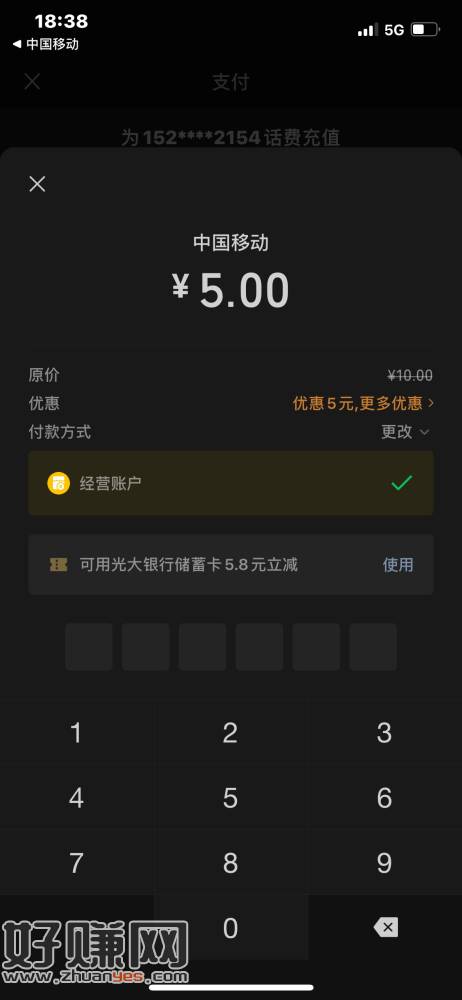 刚充今天中的深工10-5的话费,看到光大有5块8优惠。我光大