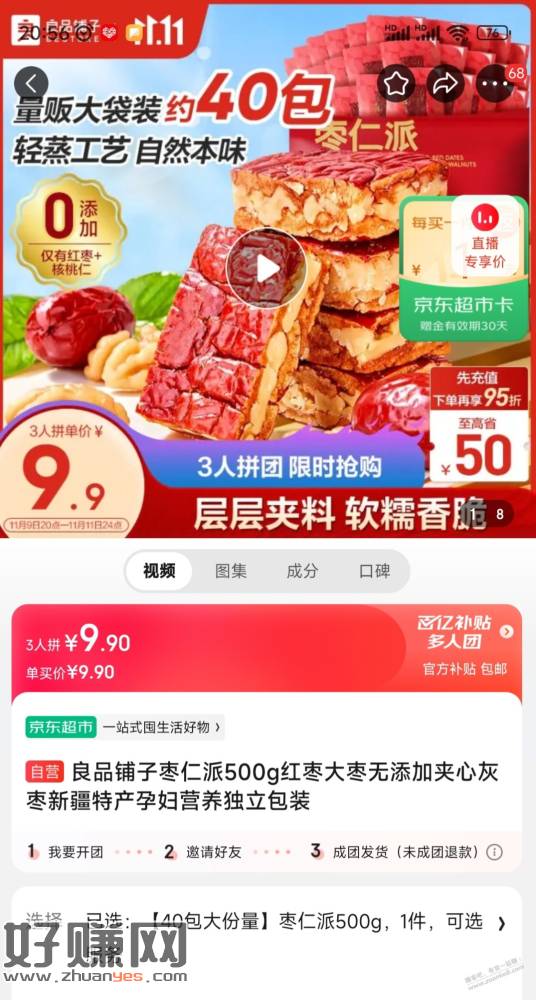 京东百亿补贴,多人团里 良品铺子枣仁派500g三人拼团9.9元,价格可以,之前买过