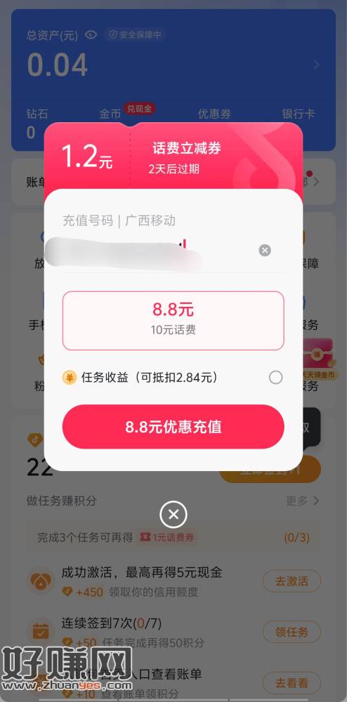 dy极速版 打开我的钱包 弹话费充值券 8.8充10 需要可