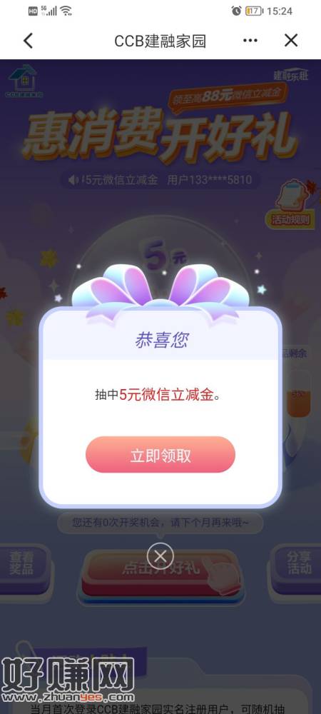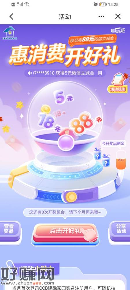 建行惠消费开好礼,还没开的可以试一下刚刚中了5块