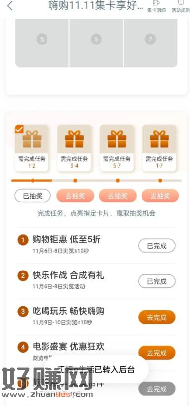 任务中心 1111集卡 没做任务的去做,最后一个任务要1-7才能抽