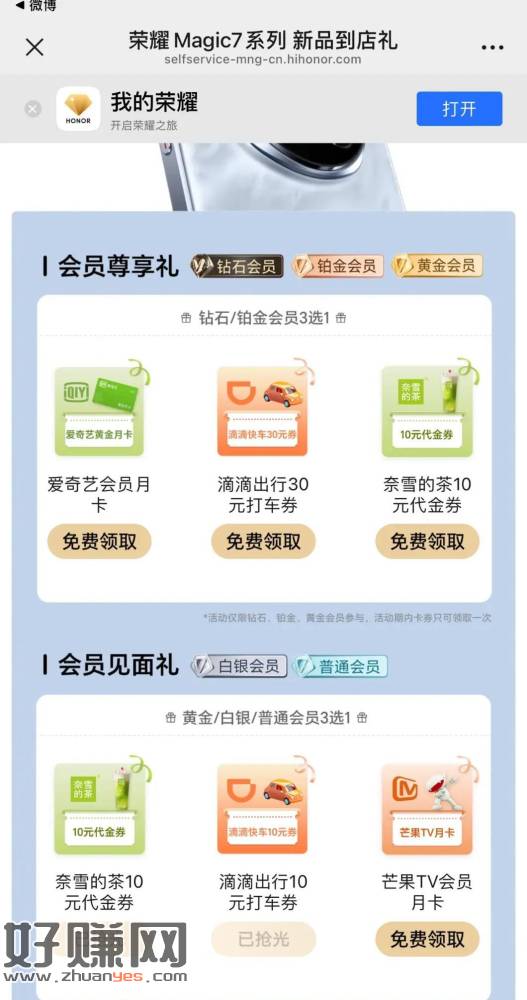 荣耀到店免费领视频会员月卡、奈雪的茶代金券、滴滴出行打车券