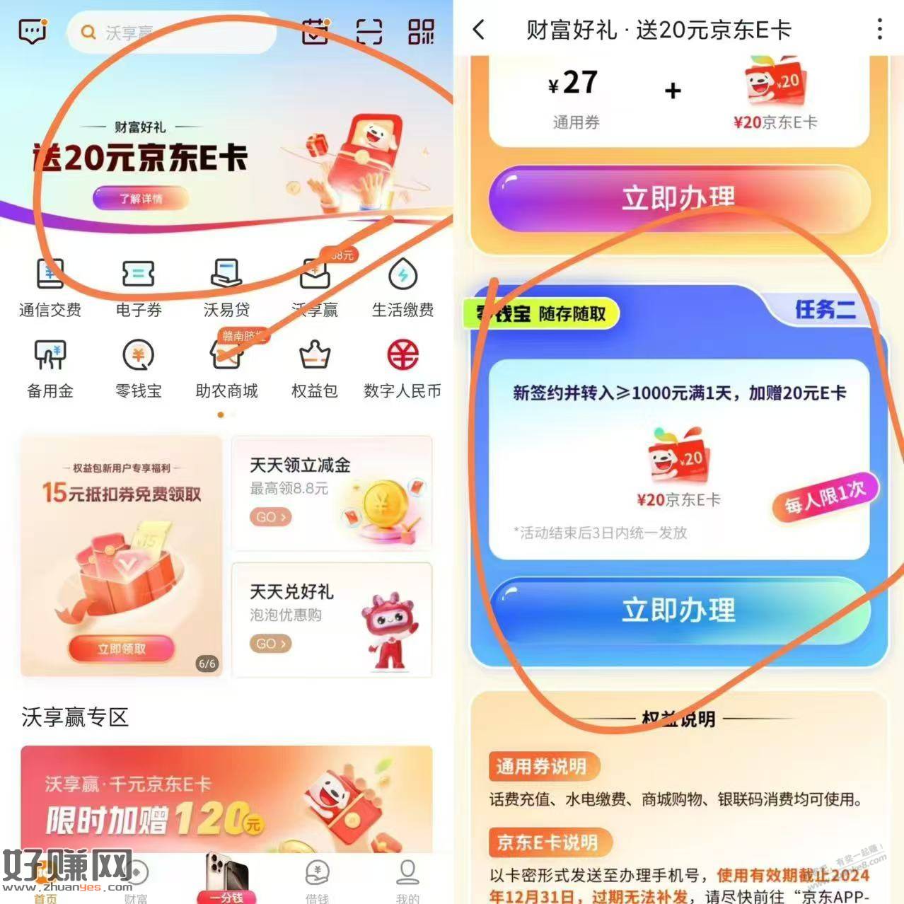 限联通号,沃钱包APP-首页顶部横幅20E卡-任务二存1000满1天送20e卡,开通众邦银行电子卡,app9.9买30猫眼