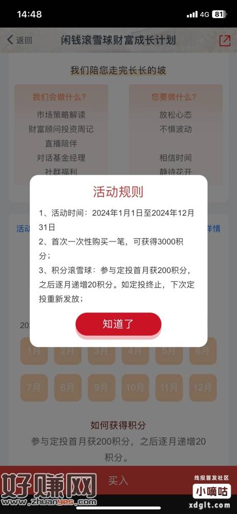 或首页下拉闲钱滚雪球财富成长计划放1000进去,确认后领取3000积分加1000首投积分