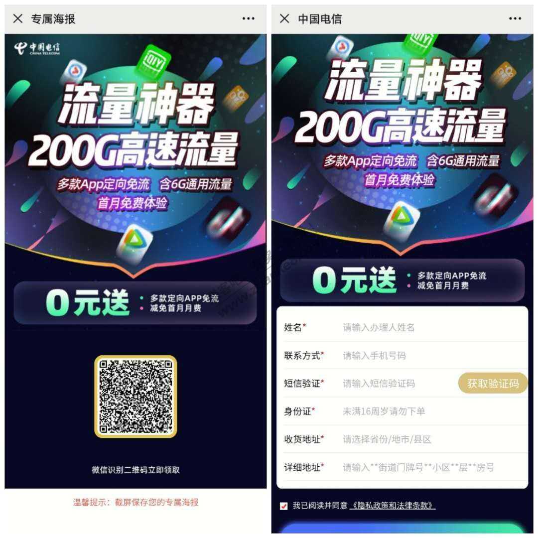 免费领电信卡,送20话费,6G通用流量,用完可以注销,好像每月都能领一次