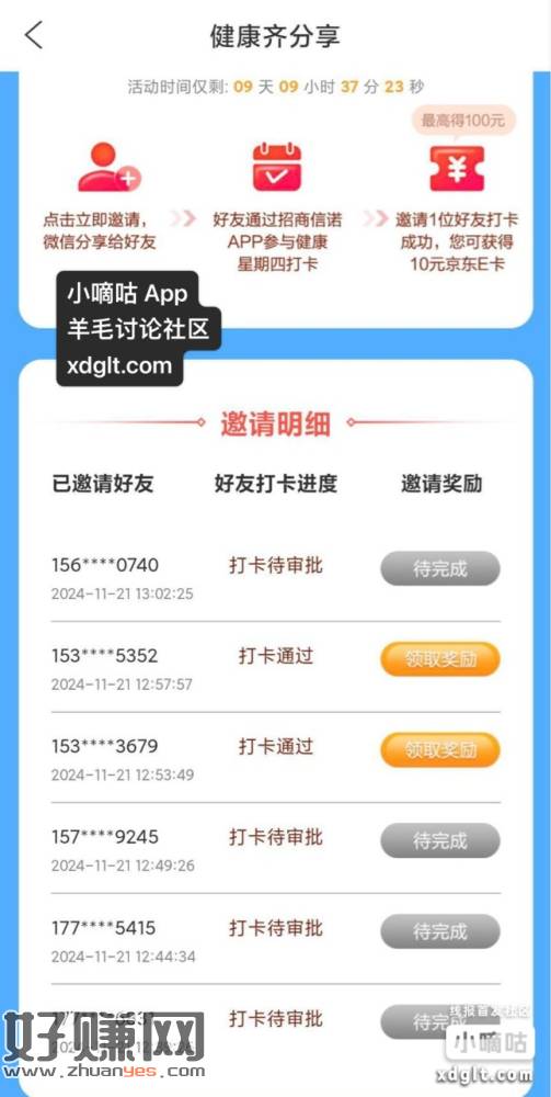 招商信诺App健康星期四邀友打卡(分享日常运动时刻)领100元京东e卡