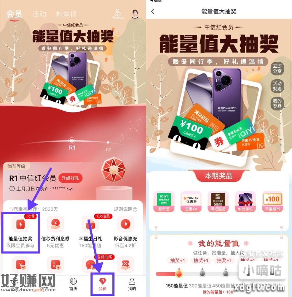 全员赠送1次机会!中信银行APP底部“会员”->能量值抽奖->简单浏览次日发放能量值,每150能量值抽实物或立减金