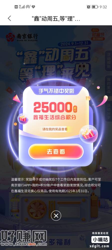 南京银行APP每周五别忘了去做财富接力任务,买1W理财后抽奖,任务做完撤单,奖品保底500积分