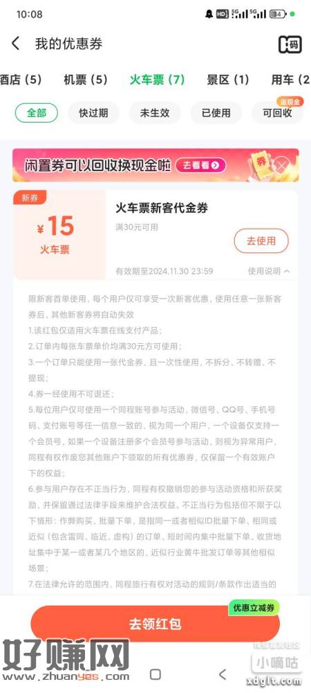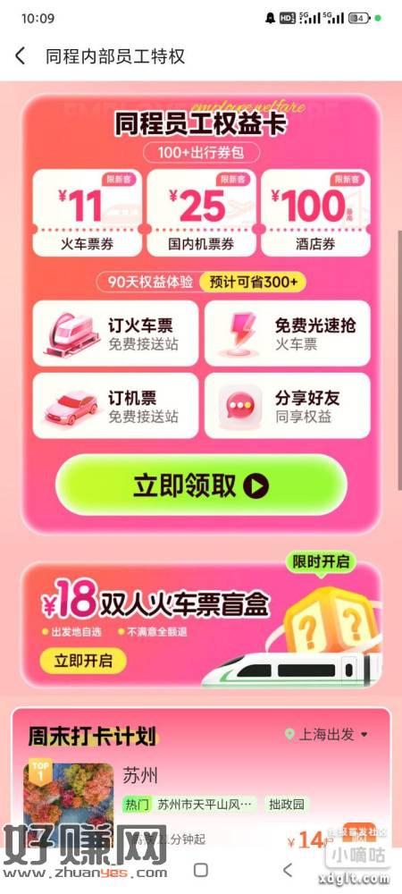 【31-11火车票券】同程旅行挨批批搜索“权益出行”->直接领权益会员,有火车票31-11亓券 和-25飞机票券 部分城市享飞机/火车免费接送站