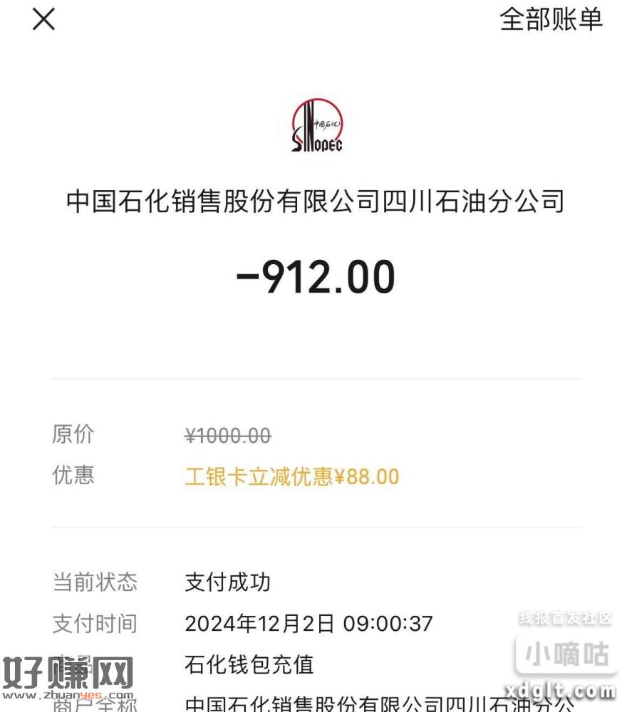 每周一中石化易捷加油微信支付工行xing/用卡1000减88开始了