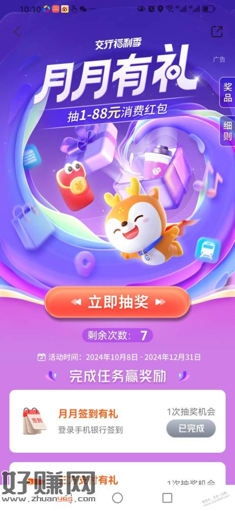 App搜 月月有礼,做简单任务可获得多次抽奖,可中支付券,话费券等。