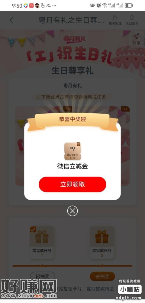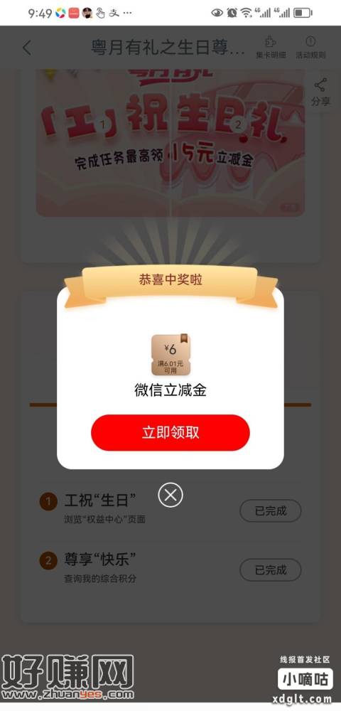 任务中心,享活动,粤月有礼生日之尊享礼,可中9和6总15微信立减金。刚中