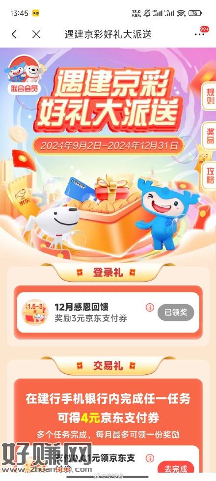 狗东搜建行联合会员,12月感恩回馈3元支付券还有