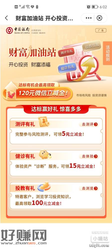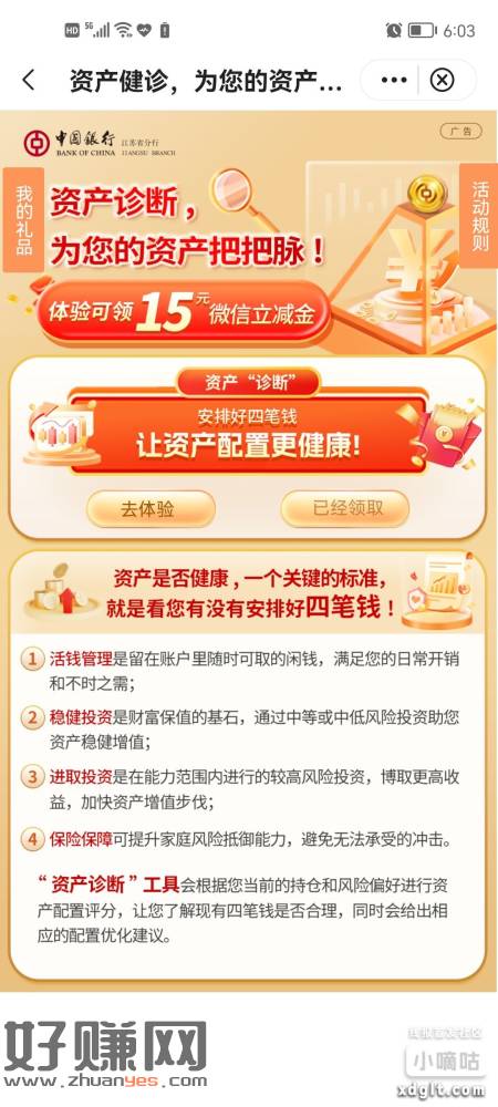 中行江苏分行大毛,有的任务好像除苏州。路径:生活-为您优选-权益吧-财富加油站,共3个任务,第一个风评有礼,在中行无风评等级或风评过期的可以参加;第三个投教有礼,特邀,我不是,你们可以尝试;重点是第二个健诊有礼,可得15块立减金,点去体验,做资产诊断,我不确定是不是要按诊断出来的结果进行配置,我个人是买了10块理财,等3个工作日之后,就可以领这个任务的奖励了。活动上个月就有了,上个月底看见的,实测领到了奖励才来发的线报,奖励数量有限,先到先得!